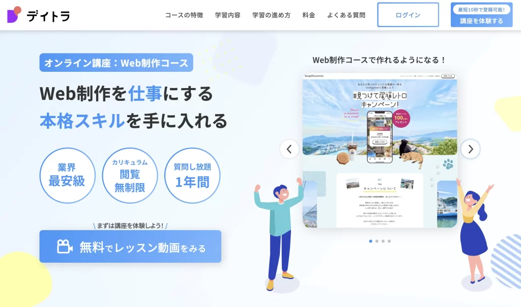 独学を継続するのが難しそうなら、オンラインスクール『デイトラ』を受講しましょう。コスパが高い定番のスクールです。コーディングが学べる『Web制作コース』が格安の約13万円です。デイトラはコミュニティが活発なので、一緒に勉強する仲間と出会えて、学習のモチベーションも保ちやすいです。